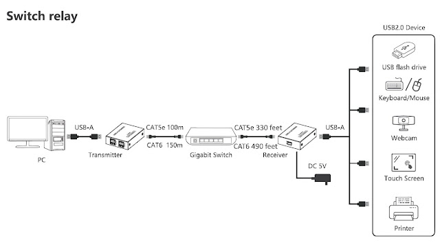 Switch relay connects the transmitter to the receiver through a gigabit switch. This scheme will increase the transmission range to "490 + Switch + 490" feet.